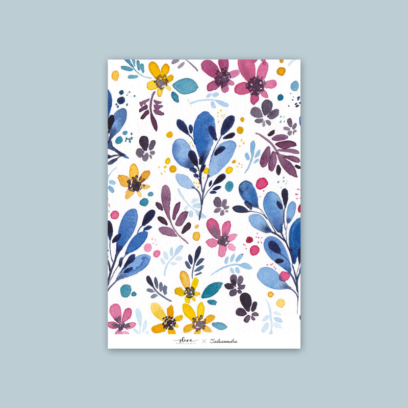 Carte Aquarelle – Fleurs en couleur bleu, rose et jaune