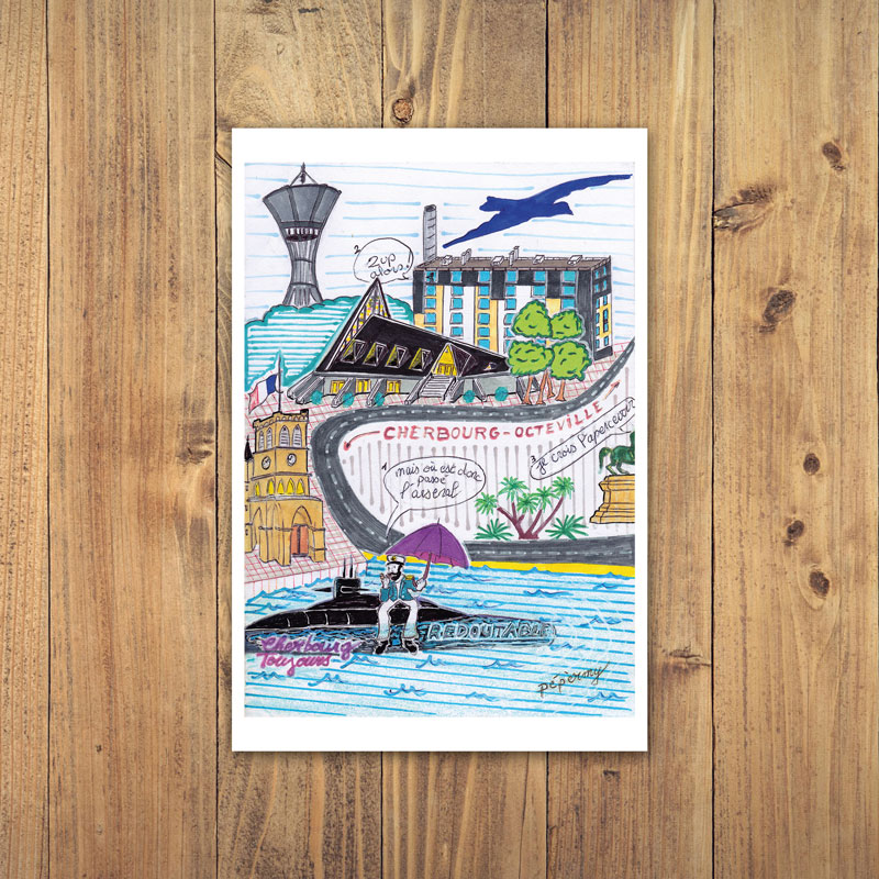 Dessin représentant le un mélange de lieux emblématiques et symboles de la ville de Cherbourg, le château d’eau, l’église, Napoléon, le port, un sous-marin, le quartier de la Zup… et des clins d’oeil sur l’histoire de Cherbourg.