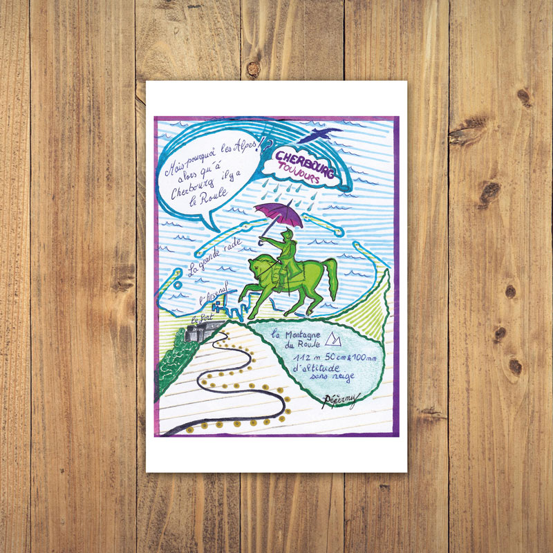 Dessin représentant le un mélange de lieux emblématiques et symboles de la ville de Cherbourg, la grande rade, le fort, la Montage du Roule, Napoléon, le parapluie… et des clins d’oeil sur l’histoire de Cherbourg.