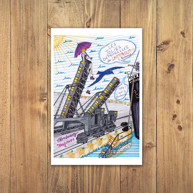 Dessin représentant les passerelles de la gare transatlantique de la ville de Cherbourg, appelée « les demoiselles », et toujours quelques clin d’oeil sur l’histoire de la ville.
