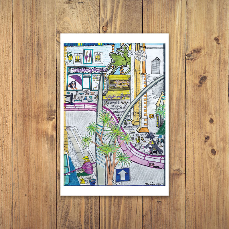 Dessin représentant un mélange de plusieurs lieux et symboles de la ville de Cherbourg (Napoléon, le port, église, rue au blé, parapluie de Cherbourg…), et toujours quelques clin d’oeil sur l’histoire de la ville.